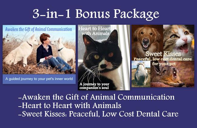 Based on my lifelong conversations with animals, I've created two guided journeys that will help you gain a solid foundation in communicating with animals: Awaken the Gift and Heart to Heart. As well, you can learn to clean your pet's teeth peacefully using a combination of practical advice and intuition, with Sweet Kisses.